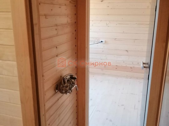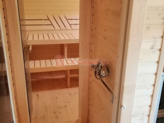 Такую баню можно построить только под ключ, а значит для сруба нужно выбирать брус, который не подвержен усадке — сухой брус камерной сушки или клееный. Из ели или кедра на выбор (второй вариант, конечно, предпочтительнее). Печь, вентиляция, двери-окна, освещение, электрика, покраска — всё входит в стоимость бани.
