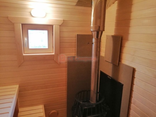 Установка печи Теплодар Русь сетка 12 л панорама ( со стеклянной дверцей ), трубы сэндвич, проходы и зонт входят в стоимость бани. Экран металлический через стену. На полу кладется кирпич, базальтовый картон, минерит. На стенах базальтовый картон, минерит, через втулки прикручивается минерит. Ссылка на сайт производителя https://www.teplodar.ru/catalog/detail/rus_setka_12_l_panorama/