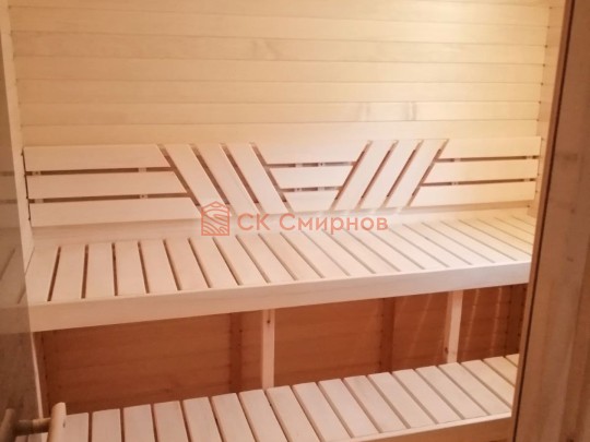 В комплект бани входит стол и две скамейки из доски 19мм, как на фото. Есть комплекты из более толстой доски а также из кедра, смотрите в доп комплектации.