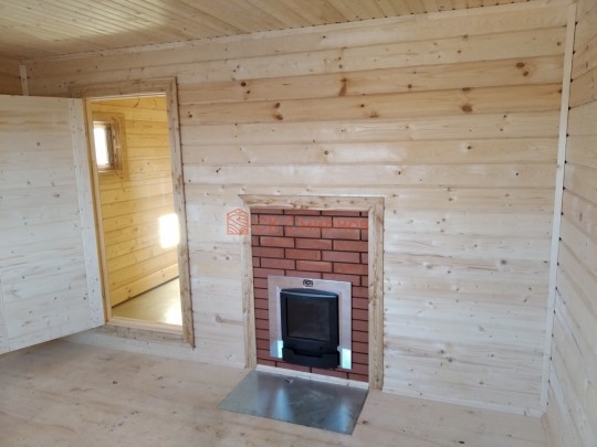 Внутри планировка вполне простая: есть прихожая, большая комната для отдыха, помывочное помещение с выведенным краном и парная. Установлена отличная печь Теплодар с панорамной дверцей. Топка вынесена в комнату и обложена кирпичом: безопасно, красиво, аккуратно.