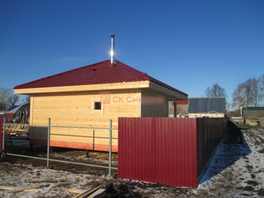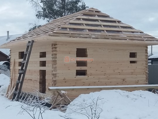 В ноябре 2020 мы завершили строительство первой одноэтажной бани с террасой 6 на 6 метров по проекту №306. Снаружи баня довольно простая: квадратный сруб, шатровая крыша, довольно просторная терраса. Таких бань по русским деревням и посёлкам найдётся немало. Нашу баньку отличает, прежде всего, качество исполнения.