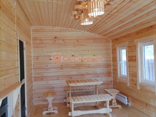 Авторские проект одноэтажной бани «Шале» с необычной округлой крышей, высокими панорамными окнами и небольшой террасой. Такую баню можно построить только из сухого или клееного профилированного бруса в комплектации под ключ. Из бруса естественной влажности и под усадку построить НЕВОЗМОЖНО.